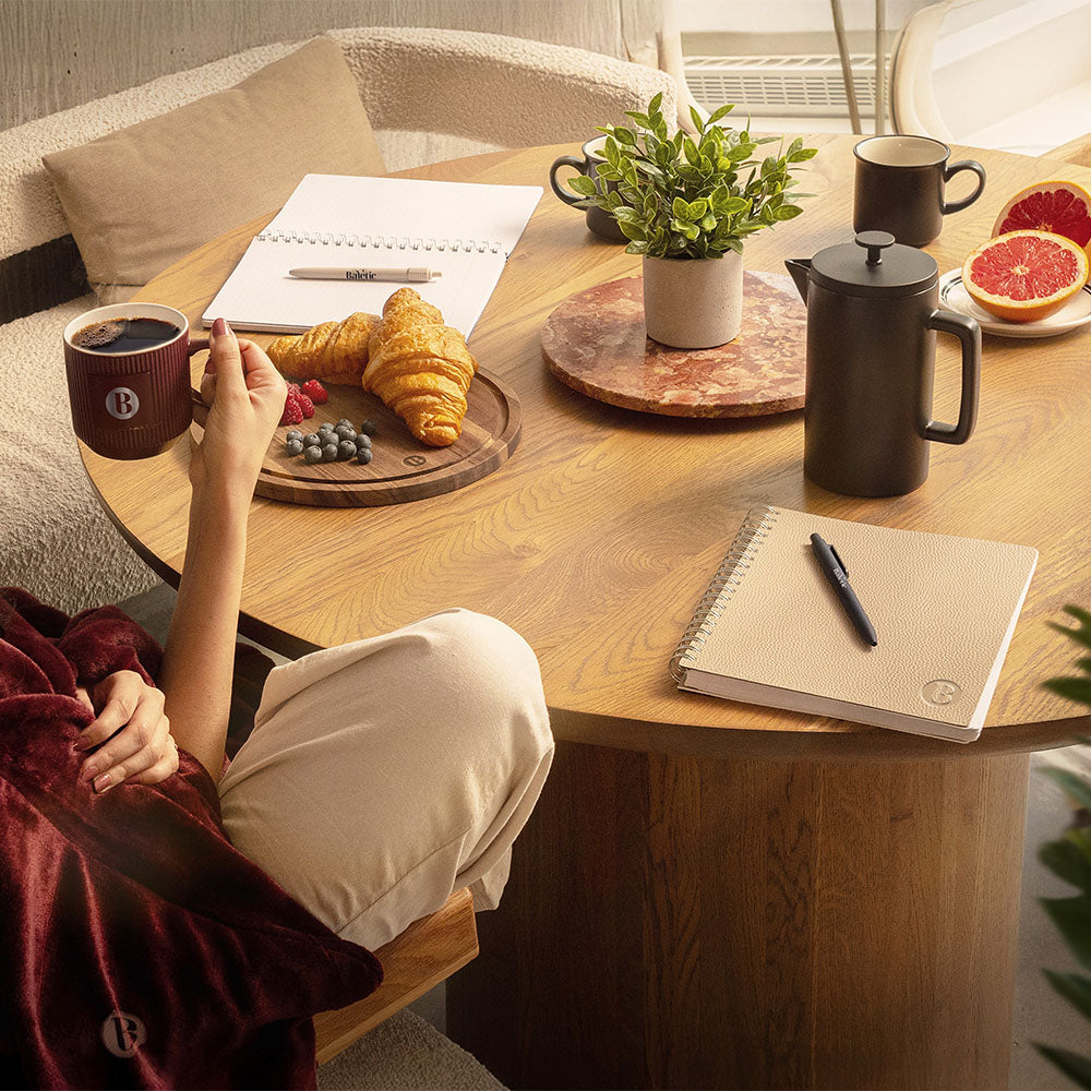 A quiet place for busy thoughts. FSC-certified 100g pages give pen strokes a calm home; 194 dated sheets sit inside a soft PU cover, 9.75" × 7.375", held by gunmetal twin-wire.
